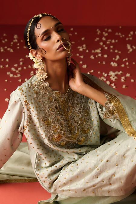 Green kurta featuring hand embroidery with sequins, dabka, nakshi, and zari work. Paired with matching plain pants and an embroidered dupatta.