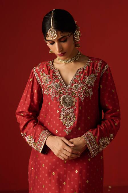 Maroon kurta featuring full sleeves, notched neckline, and hand embroidery with sequins, dabka, nakshi, and zari. Paired with a contrasting plain pant with embroidered hemline and an embroidered matching dupatta.