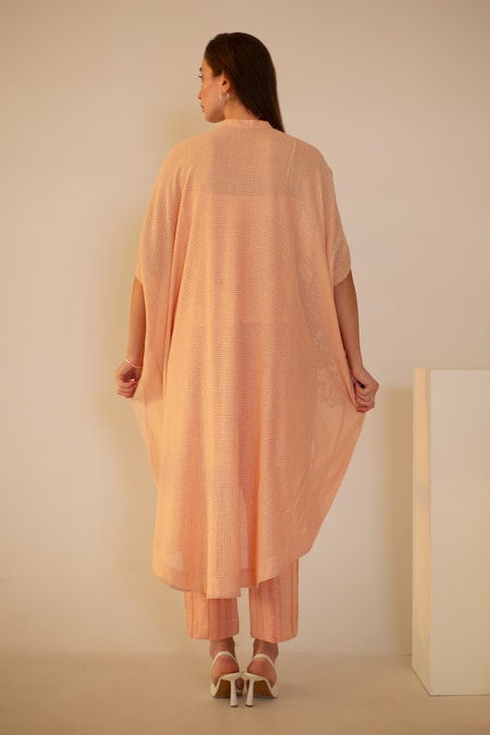 Blush pink kurta featuring abstract motif hand applique embroidery with a low high front back hem. Paired with handwoven textured pants and an inner slip.