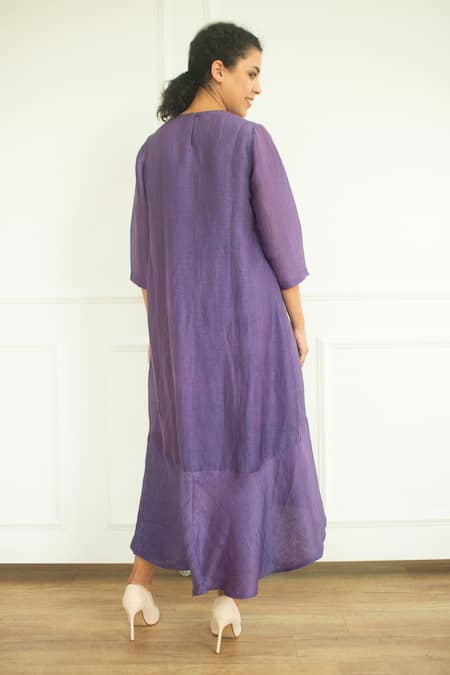 Plum handloom linen silk asymmetrical tunic with floral applique hand embroidery. Comes with handloom silk striped pant.