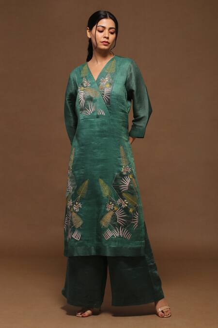 Green kurta with applique work floral motifs & side slits. Paired with tissue silk pant & stole.