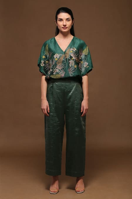 Oja_Green Pant Tissue , Shirt Handloom Linen Floral V Applique And Set _Online_at_Aza_Fashions