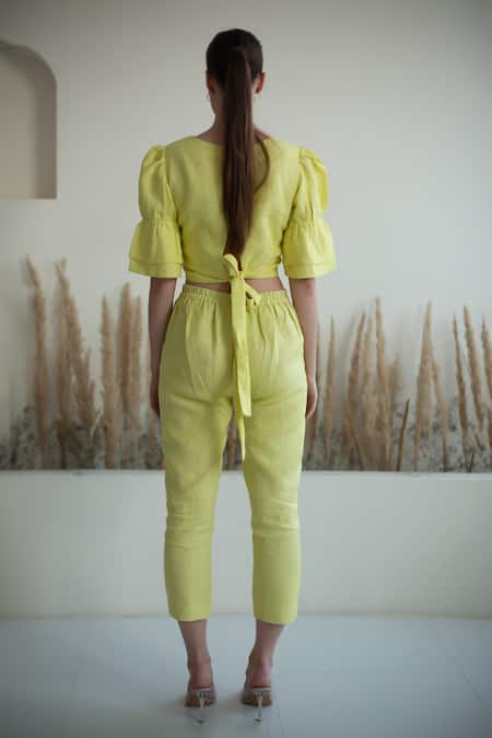 Lemon yellow crop top featuring puff sleeves, square neckline, and embroidered floral motifs with beads and sequins. Paired with coordinating stripe woven pant.