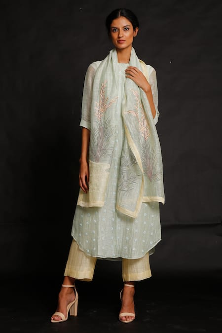 Light blue shirt style kurta with floral applique embroidered motifs. Paired with pant & embroidered dupatta.