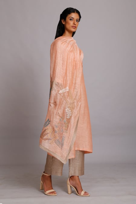Peach 30% Silk, 70% Linen Handloom Embroidered Kurta Set