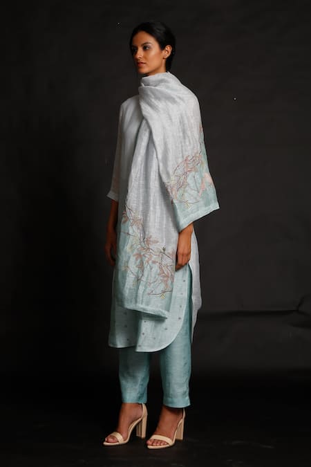Buy_Oja_Blue 30% Silk, 70% Linen Handloom Embroidered Kurta Set _at_Aza_Fashions