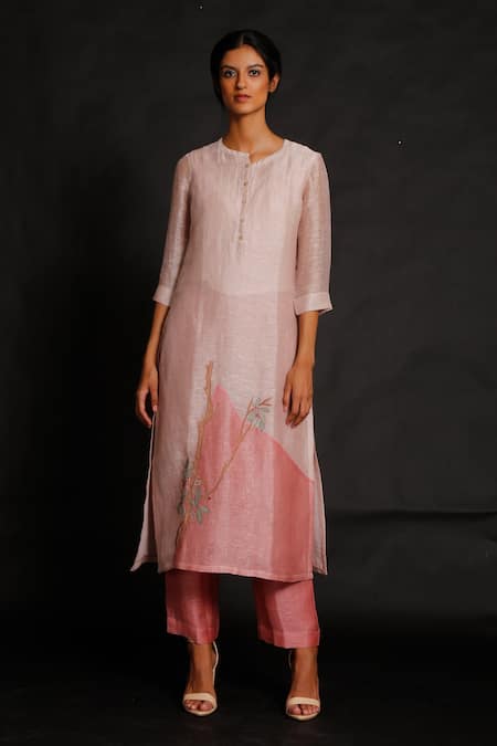 Pink 30% Silk, 70% Linen Handloom Embroidered Kurta Set