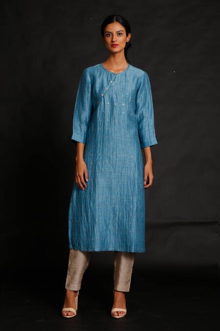 Blue 30% Silk, 70% Linen Handloom Embroidered Kurta Set