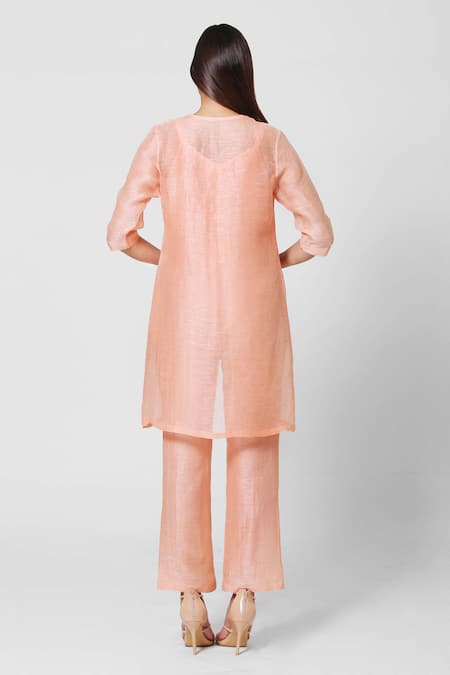 Peach 30% Silk, 70% Linen Jumpsuit Round Jacket Open With