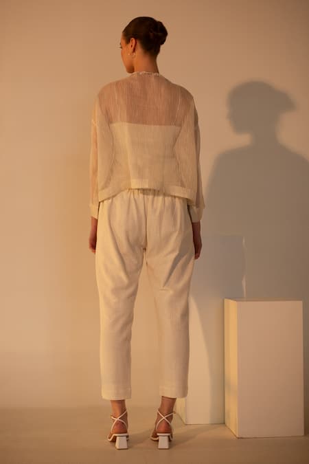 Ivory high low short jacket featuring thread and applique embroidered earthy palm tree motifs crafted using seven line weaving technique. Paired with coordinating knitted pant and inner slip.