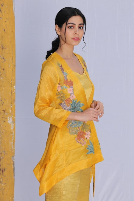 Yellow asymmetrical jacket with applique work floral motifs & tie-up detailing at the waistline. Comes with a linen satin bustier & pant.