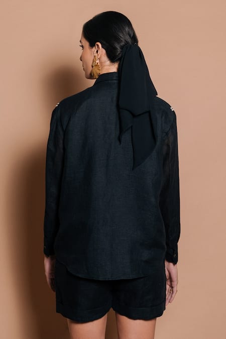 Buy_Ojasmé By Sanjana Thapa_Black Linen Embroidery Collared Neena Shirt With Shorts _Online_at_Aza_Fashions
