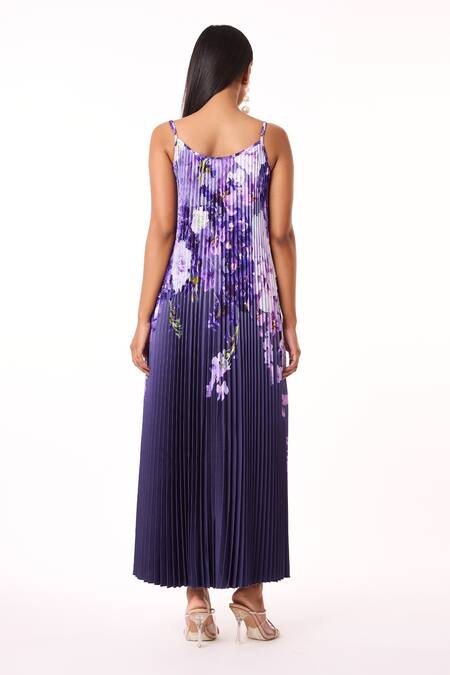 Navy maxi dress featuring accordion pleats and a scoop neckline