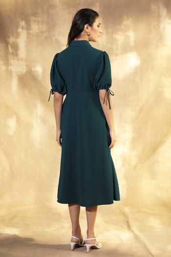 Green shirt dress with piping detail on the bodice & tie knot puffed sleeves.