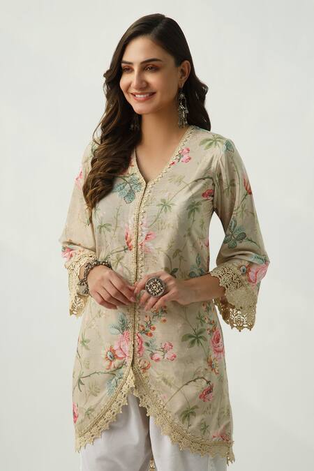 Beige velvet floral print kurta with lace work. Paired with off white tulip pant.