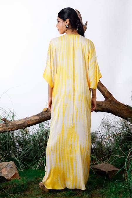 Yellow kaftan featuring a shibori pattern and bead & sequin embroidered neckline