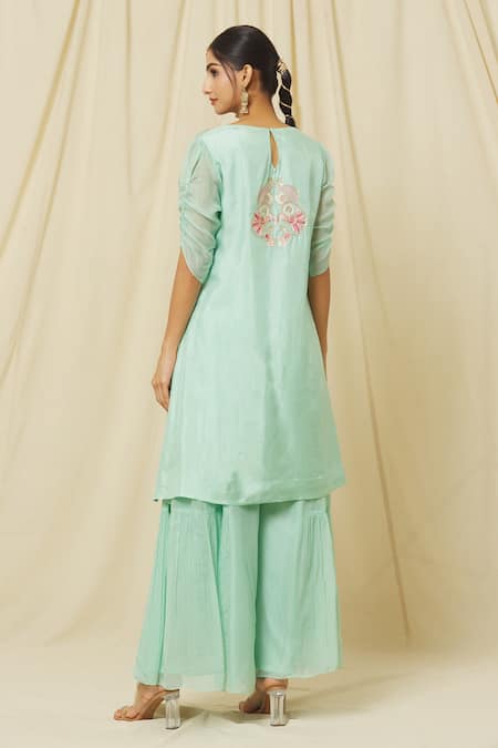 Sea green kurta featuring a boat neckline and ruched elbow sleeves. Paired with a pleated flare sharara and an organza dupatta adorned with pink floral embroidery.