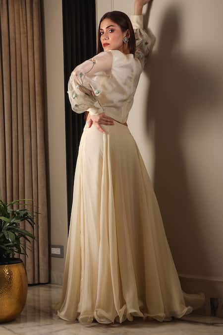 Buy_Omana By Ranjana Bothra_Ivory Organza Embroidery Square Neck Floral Anchor Top And Skirt Set _Online_at_Aza_Fashions