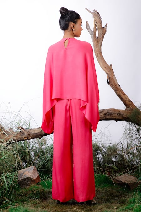 Bubblegum pink satin top featuring pearl hand embroidery at the neckline and cuff hem. Paired with relaxed fit pants, this set includes a back keyhole and an asymmetric hem design.