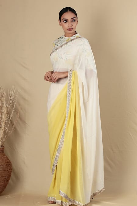 Ivory and yellow ombre saree with embroidered hem. Paired with floral print blouse with embroidered detail.