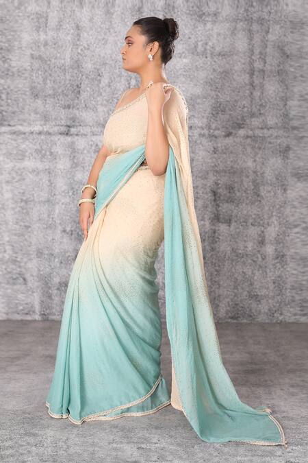 Pink & blue georgette saree with all over gold foil print & bead embroidered border. Paired with sweetheart neck corset blouse with all over bead, sequin & crystals embroidery