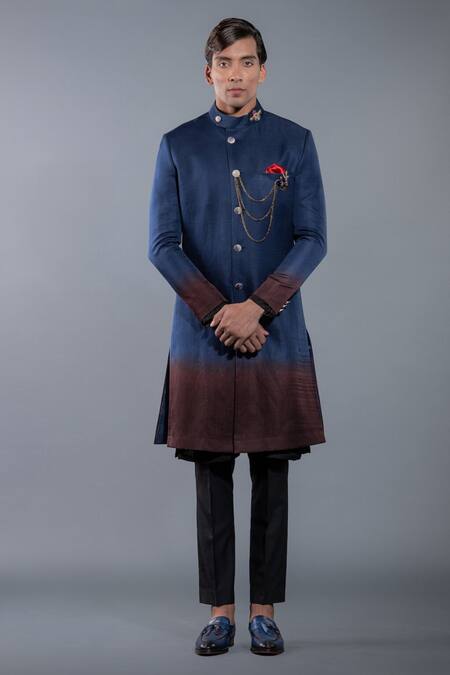 Blue ombre sherwani featuring a band collar and long sleeves