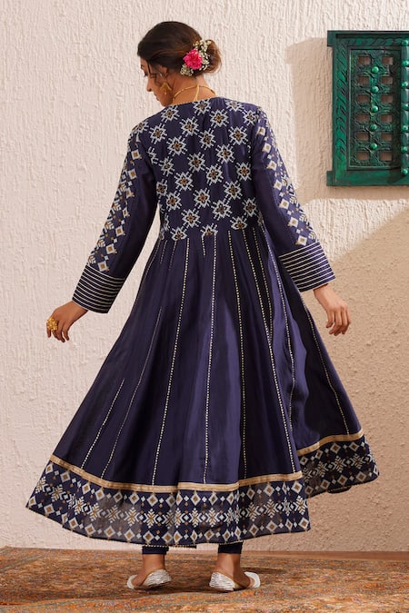 Navy blue long sleeves anarkali featuring floral block print yoke and gold detailing. Paired with churidar and organza dupatta with lace accents.