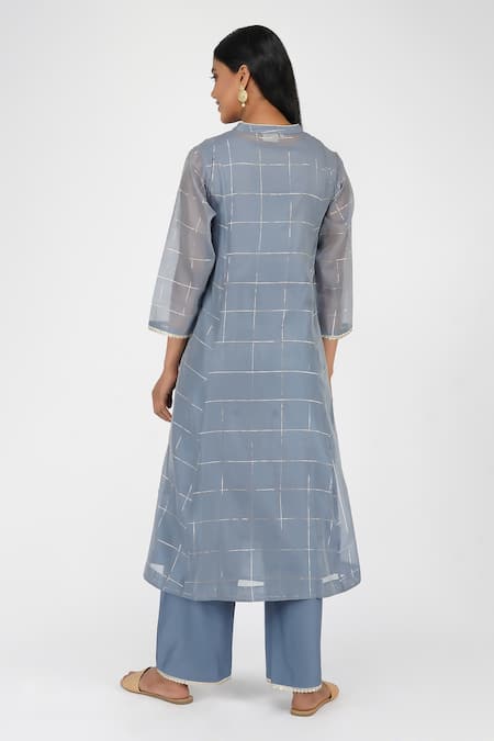 Blue Chanderi Sequins Mandarin Collar Chequered Pattern Kurta And Pant Set