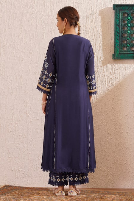 Blue Chanderi, Organza Lace Round Neck Flora Motif Print Anarkali Pant Set