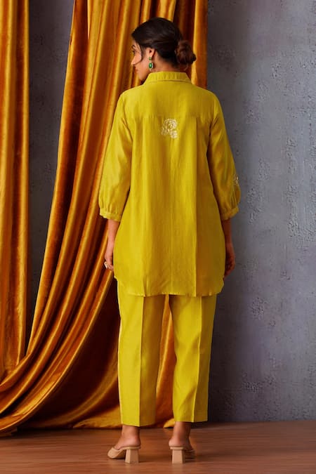 Green Chanderi Sequins, Embroidery Collared Placement Shirt Pant Set