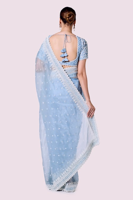 Blue organza saree featuring intricate moti work and a matching blouse. The blouse is padded and has a zip and tie-up closure at the back.