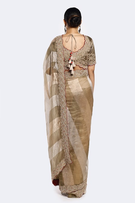 Dusty green color block saree crafted from tissue fabric featuring dabka, kasab, thread work, and sequins. Paired with an embellished blouse that complements the saree's design.