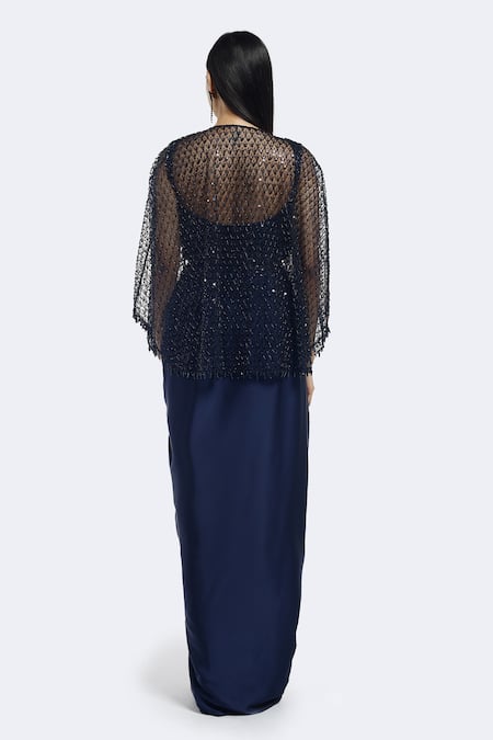 Navy blue embellished cape set featuring sequins, cheed, and beads work. Includes a matching bustier and skirt made from satin fabric.