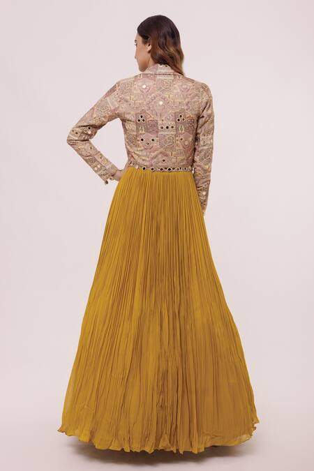 Yellow gown featuring a U neck, three-quarter sleeves, and gathered detailing. Paired with a floral embroidered jacket adorned with cutdana, mirror, and sequin work, along with a matching belt.