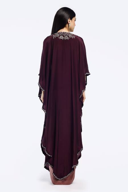 Wine Crepe Cut Work, Mirrors, Sequins Floral Embroidered Cape Skirt Set