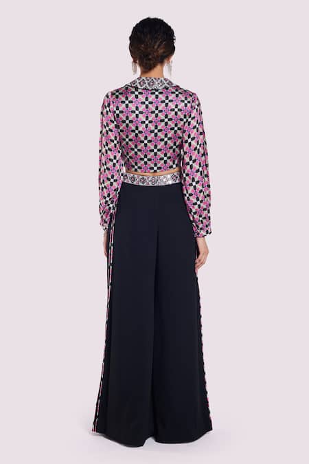 Black pant paired with a grey and pink crop top featuring geometric print and intricate embroidery. The top has a shawl collar adorned with cheed, sequin, mirror, and cutdana work.