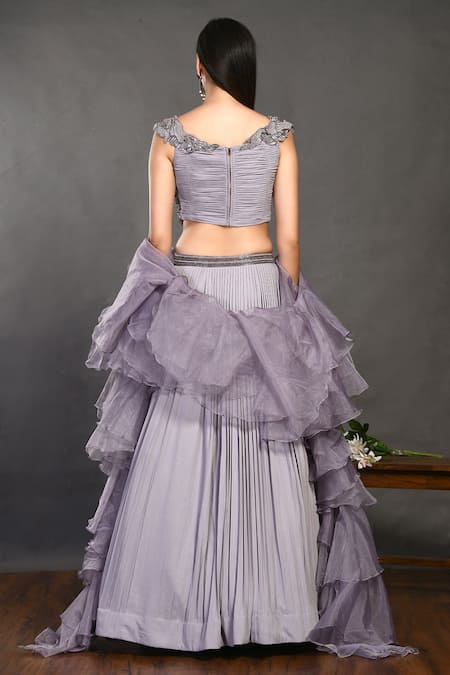 Grey pleated lehenga with embellished waistband. Paired with floral applique blouse with sequin, moti & cutdana with cutwork hem & ruffle dupatta.