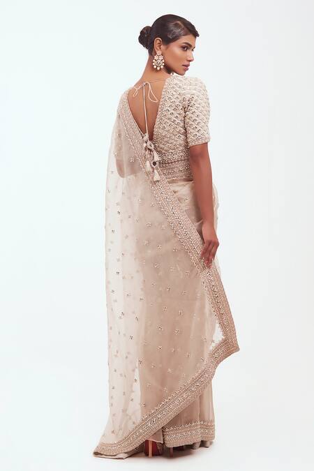 Gold Tissue Embellished Mirror V Neck Saree And Blouse Set