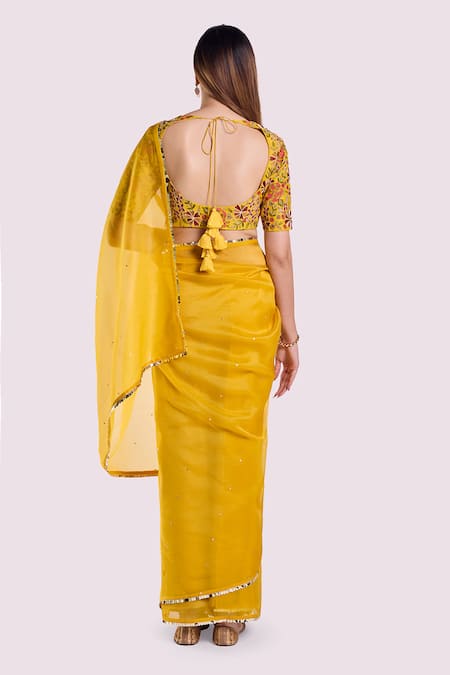 Yellow organza saree adorned with resham and sequins work. Paired with a matching embroidered blouse featuring intricate floral designs.