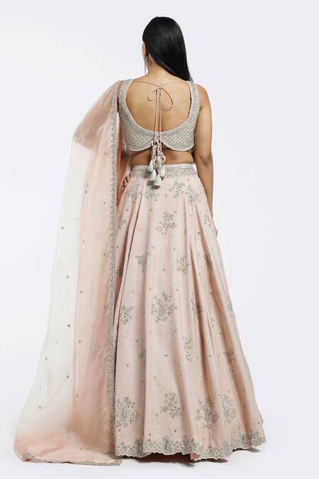 Thread and sequence floral embroidery on lehenga, Cutdana detailing along the hem, Back tie-up detail on the blouse