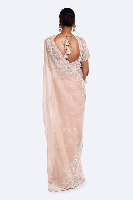 Scallop borders along the saree, Intricate pearl embroidery on floral patterns, Back tie-up detail on the blouse