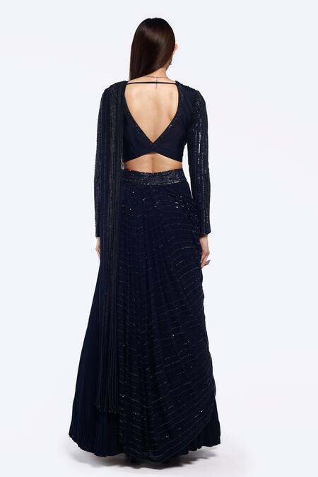 Navy blue pre-draped lehenga saree featuring sequins, cheed, and cutdana work. Accompanied by an embellished blouse with a deep V-neck and long sleeves.