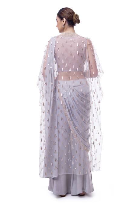 Grey moonga silk & net pre-stitched pant saree featuring cutdana and sequins embellishments. Accompanied by a padded sleeveless blouse and a flared sleeve jacket.