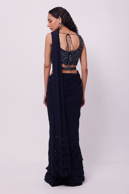 Navy blue sequin embellished blouse with ruffle trim pre-draped saree. Comes with cutdana embellished belt.