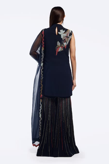 Blue kurta featuring high round neckline with cheed and cutdana embroidery. Paired with a matching sharara and dupatta.