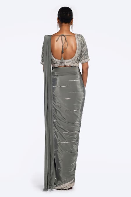 Green pre-stitched saree featuring tikki and cutdana embellishments in a stripe pattern on the pleated pallu. Paired with a floral embellished scallop bordered blouse with a back tassel tie-up.