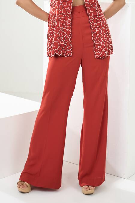 Rust orange blazer featuring bead embroidery in an abstract pattern. Paired with a matching bustier and pant made from georgette and silk satin.