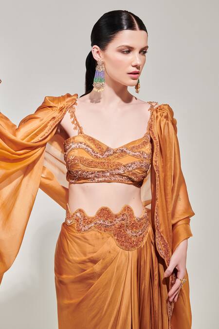 Asymmetric hem on the skirt, Bead and sequin embroidered border on cape, Padded blouse with intricate embroidery