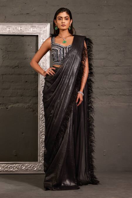 A black net blouse features delicate hand-embroidered silver and black sequins, beads, and pipe work. It is paired with a black georgette organza drape saree finished with feather detailing on the palla.