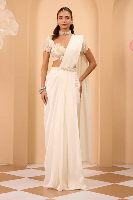 Ivory pre-draped saree made from shimmer silk with an attached blouse. The blouse features padded design and intricate embellishments in organza fabric.